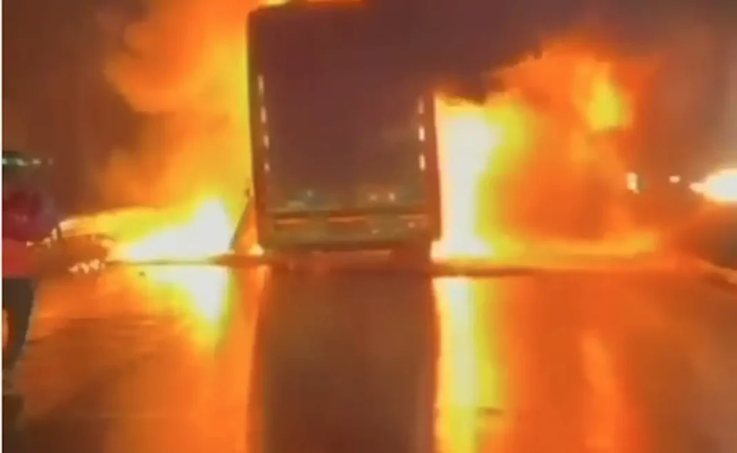 బైకు బస్సు ఢీ, చెలరేగిన మంటలు