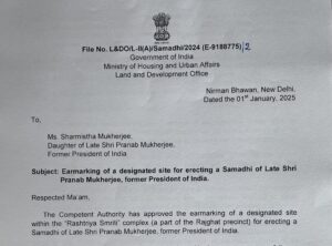 దివంగత మాజీ రాష్ట్రపతి ప్రణబ్ ముఖర్జీ స్మారక స్థలం ఏర్పాటుకు కేంద్రం మంగళవారంనాడు ఆమోదం తెలిపింది. రాజ్ఘాట్ ఆవరణలోని ‘రాష్ట్రీయ స్మృతి’ కాంప్లెక్స్లో ప్రణబ్ ముఖర్జీ సమాధి ఏర్పాటుకు అవసరమైన స్థలం కేటాయించనట్టు కేంద్రం ప్రకటించింది. ఈ నిర్ణయం పై ప్రణబ్ ముఖర్జీ కుమార్తె షర్మిష్ట ముఖర్జీ సంతోషం వ్యక్తం చేస్తూ, ”ప్రధానమంత్రి నరేంద్ర మోదీ, బాబా (ప్రణబ్) స్మారకం ఏర్పాటు చేయాలని తీసుకున్న నిర్ణయానికి మేము కృతజ్ఞతలు తెలిపేది,” అని ట్వీట్ చేశారు.