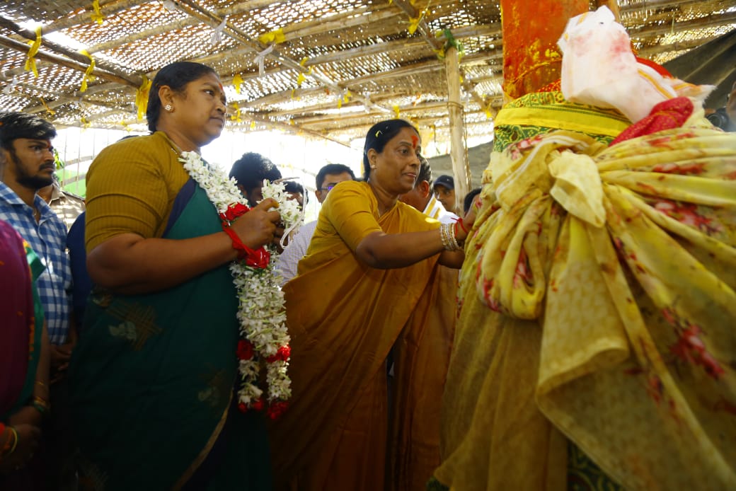 శుక్రవారం తాడ్వాయి మండలంలోని మేడారం శ్రీ సమ్మక్క సారలమ్మ అమ్మవార్లను దర్శించుకున్న రాష్ట్ర పంచాయితి రాజ్, గ్రామీణ అభివృద్ధి, గ్రామీణ నీటి సరఫరా, మహిళా, శిశు సంక్షేమ శాఖ మంత్రి ధనసరి అనసూయ సీతక్క, పర్యావరణ, అటవీ, దేవాదాయ ధర్మాదాయ శాఖ కొండా సురేఖ, ఎంపీ బలరాంనాయక్, జిల్లా కలెక్టర్ దివాకర టి.ఎస్. లకు గిరిజన పూజారులు, ఎండోమెంట్ అధికారులు సన్నాయి, డోలువాయిద్యాలతో ఘనస్వాగతం పలికారు.