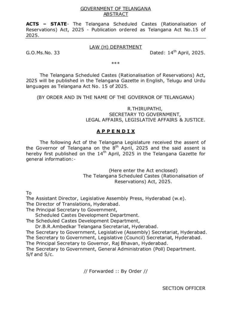 ఎస్సీ వర్గీకరణపై తెలంగాణ ప్రభుత్వం కీలక నిర్ణయం తీసుకుంది. 56 ఎస్సీ కులాలను మూడు గ్రూపులుగా విభజిస్తూ జీవో విడుదల చేసింది. ఈ నిర్ణయంతో ‘‘ఏ’’ గ్రూపుకు 1%, ‘‘బీ’’ గ్రూపుకు 9%, ‘‘సీ’’ గ్రూపుకు 5% చొప్పున రిజర్వేషన్లు కల్పించనుంది. సామాజిక న్యాయం లక్ష్యంగా ఎస్సీ వర్గీకరణ చేయడం ద్వారా వంచిత, అట్టడుగు వర్గాలకు మరింత న్యాయం చేకూరుస్తామని ప్రభుత్వం ప్రకటించింది. దీని ద్వారా అన్ని ఎస్సీ కులాలకు సరసమైన ప్రాతినిధ్యం లభించేలా చర్యలు తీసుకోవడం జరుగుతోంది. ఈ జీవో అమలుతో సమాజంలో సమానత్వం, సంక్షేమం దిశగా మరొక అడుగు వేసినట్లు భావిస్తున్నారు.